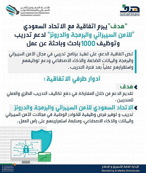 وبموجب الاتفاقية، سيتعين على “هدف” تقديم الدعم من خلال المشاركة في تحمل تكاليف التدريب النظري والعملي للمتدربين، في حين سيتولى “الاتحاد السعودي للأمن السيبراني والبرمجة والدرونز” توفير فرص وظيفية للكوادر الوطنية في مجالات الأمن السيبراني والبرمجة والبيانات الضخمة والذكاء والاصطناعي، ومتابعة استمراريتهم على رأس العمل.