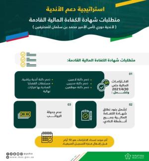 قررت لجنة الكفاءة المالية للأندية الرياضية بوزارة الرياضة، تحديد متطلبات شهادة الكفاءة المالية القادمة، لأندية دوري كأس الأمير محمد بن سلمان للمحترفين، وأندية دوري الأمير محمد بن سلمان للدرجة الأولى، والتي تشترط سداد كافة الالتزامات المالية المستحقة والواجبة السداد، حتى 30 إبريل 2021م.