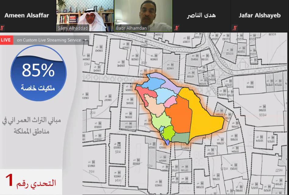 وجاء في كلمة المهندس الحمدان قوله أن التحدي الرئيس أمام عودة الحياة لمباني التراث العمراني في المملكة كون 85% منها ملكيات خاصة وأن 80% من هذه الملكيات لا توجد لها وثائق مما يسبب في توقف الكثير من المبادرات الاستثمارية، كما أن نزع الملكيات من قبل الدولة لا يحقق الاستدامة المطلوبة.