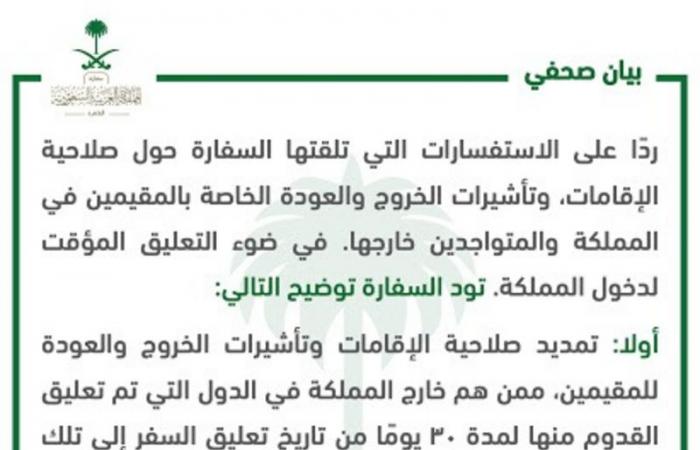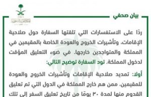 أعلنت سفارة خادم الحرمين الشريفين في القاهرة في موقعها على منصة تويتر أنه ردًا على الاستفسارات التي تلقتها السفارة حول صلاحية الإقامات وتأشيرات الخروج والعودة الخاصة بالمقيمين في المملكة والمتواجدين خارجها في ضوء التعليق المؤقت لدخول المملكة تود السفارة توضيح الآتي: