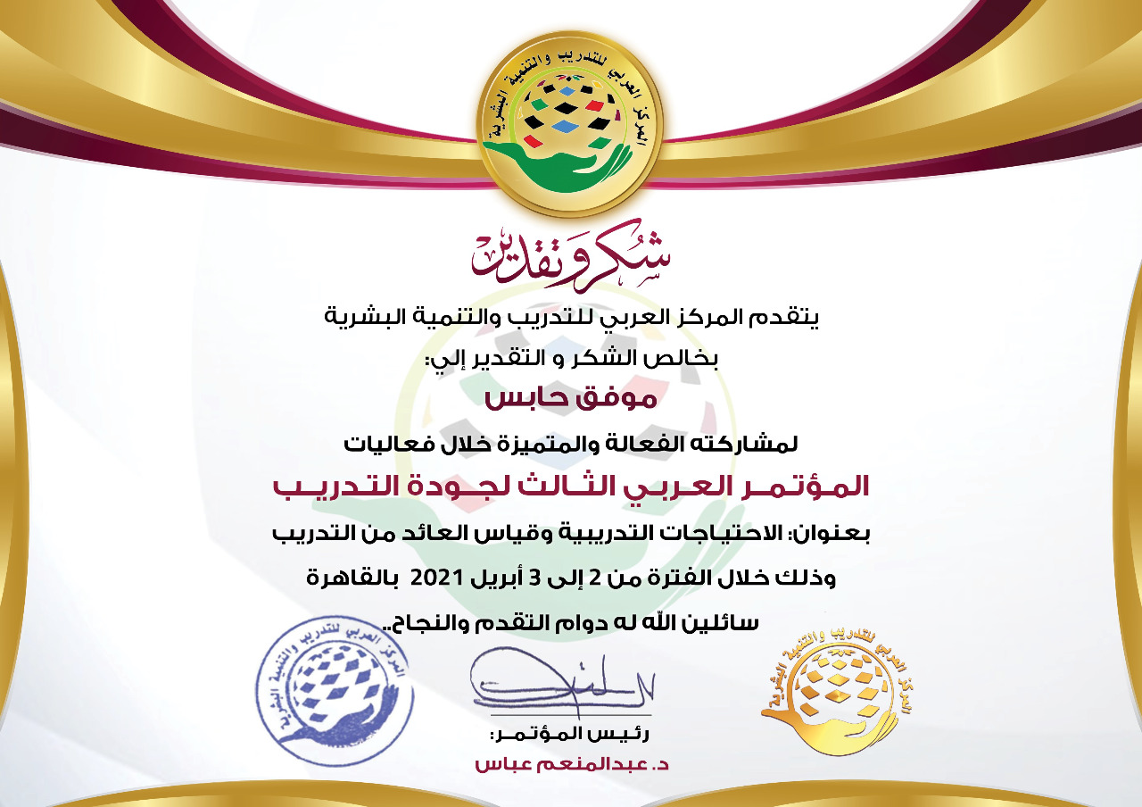 منح المركز العربي للتدريب والتنمية البشرية المستشار موفق حابس مدير عام أكاديمية التدريب والاستشارات شهادة شكر وتقدير لمشاركته الفعالة والمتميزة خلال فعاليات المؤتمر العربي الثالث لجودة التدريب بعنوان الإحتياطات التدريبية وقياس العائد من التدريب الذي عقد على مدار يومي الثاني والثالث من أبريل في القاهرة برئاسة الدكتور عبد المنعم عباس نقيب المدربين العرب