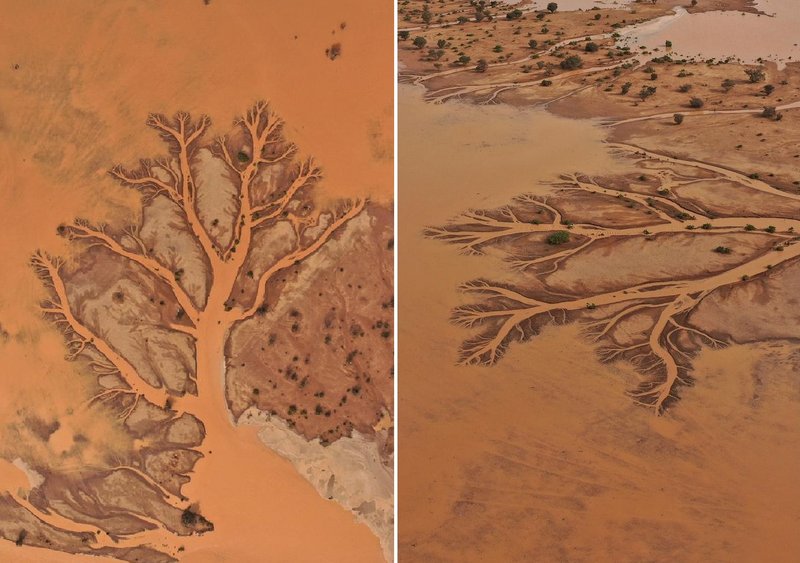 والتقط البداح؛ صورة جوية لأمطار غرب الخرمة بعدما شكّل جريان مياه السيل لوحة جمالية، على شكل شرايين الجسد بين نفود المنطقة.