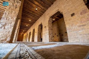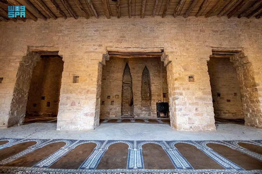 وعلى مرأى العين تكمن جماليات المسجد متوسطاً البساتين وإلى جانبه شواهد معمارية من تاريخ منطقة الجوف.