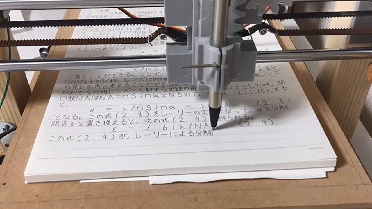 تستطيع هذه الآلة، التي تمت تسميتها باسم ”آلة كتابة التقارير بخط اليد آليا بشكل كامل“، تستطيع أن تنسخ النصوص التي تمت كتابتها في الحاسوب على الورق.
