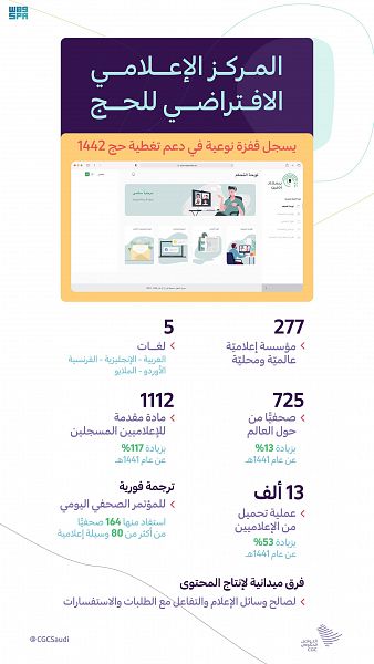 ووفّر المركز الإعلامي الافتراضي خدمة البث المباشر للمؤتمر الصحفي اليومي للحج، الذي شارك فيه المتحدثون الرسميون لوزارات الصحة والداخلية والحج والعمرة، مقرونًا بالترجمة الفورية باللغات الإنجليزية والفرنسية والأوردو والملايو، حيث استفاد منها 164 صحفيًّا من أكثر من 80 وسيلة إعلامية.