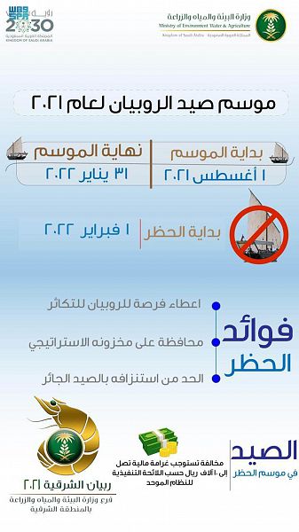 أنهى فرع وزارة البيئة والمياه والزراعة بالمنطقة الشرقية -ممثلاً في مركز أبحاث الثروة السمكية بالقطيف ووحدة الثروة السمكية بالجبيل- إصدار التصاريح الخاصة بصيد الروبيان للقوارب الموجودة على طول ساحل الخليج العربي للموسم 2021م الذي سينطلق في الأول من أغسطس لمدة 6 أشهر.