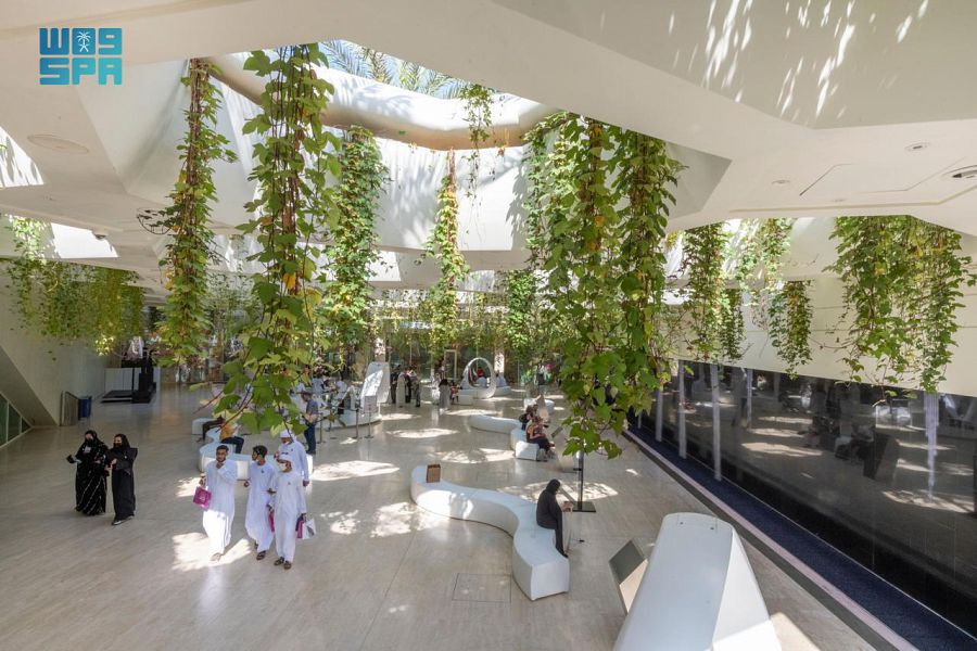 وبعد ذلك ينتقل الزوار إلى سلم كهربائي تعلوه بلورات “سينوغرافية” يبلغ عددها 2030 بلورة، ترمز إلى رؤية “السعودية 2030″، وتصحبه نافذة تُطلّ على أهم مشاريع المملكة العملاقة التي يجري العمل عليها حالياً على غرار مشروع القدية، ومشروع تطوير بوابة الدرعية، ومشروع البحر الأحمر، وغيرها من المشاريع التنموية النابضة بالحياة، المستندة إلى المفاهيم الصديقة للبيئة مثل مشروع حديقة الملك سلمان، ومشروعَي “السعودية الخضراء” و”الشرق الأوسط الأخضر”.