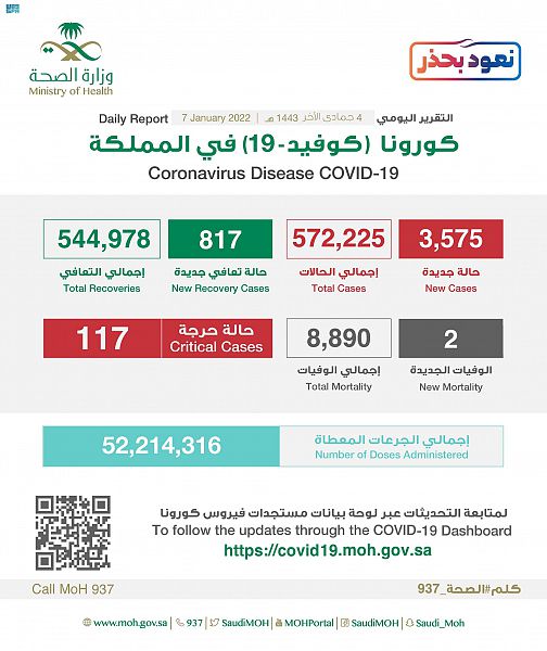 أعلنت الصحة إحصائية جديدة لمستجدات كورونا في المملكة خلال الـ 24 ساعة الماضية تضمنت تسجيل (3575) حالة مؤكدة وتعافي(817) حالة ، فيما بلغ عدد الحالات الحرجة (117) حالة.