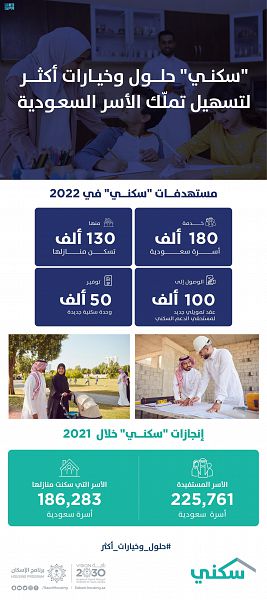 وأشار إلى أن “سكني” يستهدف خلال العام الجاري 2022 تمكين 180 ألف أسرة جديدة من الاستفادة من خيارات وحلول “سكني” المتنوعة، منها 130 ألف أسرة تسكن منازلها خلال العام 2022، وتقديم أكثر من 100 ألف قرض عقاري مدعوم، وذلك امتداداً لنضج الشراكة الفاعلة مع القطاع الخاص والتي أسهمت في رضا المستفيدين من خلال خفض نسبة الأرباح من خلال “الدعم العيني”، وتوسيع دائرة الاستحقاق بالاستفادة من “المنتج الميسر” و”برنامج الضمانات”.