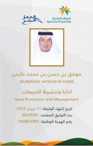 منحت وزارة الموارد البشرية والتنمية الإجتماعية السعودية المستشار موفق بن حسن حابس وثيقة خبير في مجال تنشيط المبيعات والإدارة لمدة عام جديد