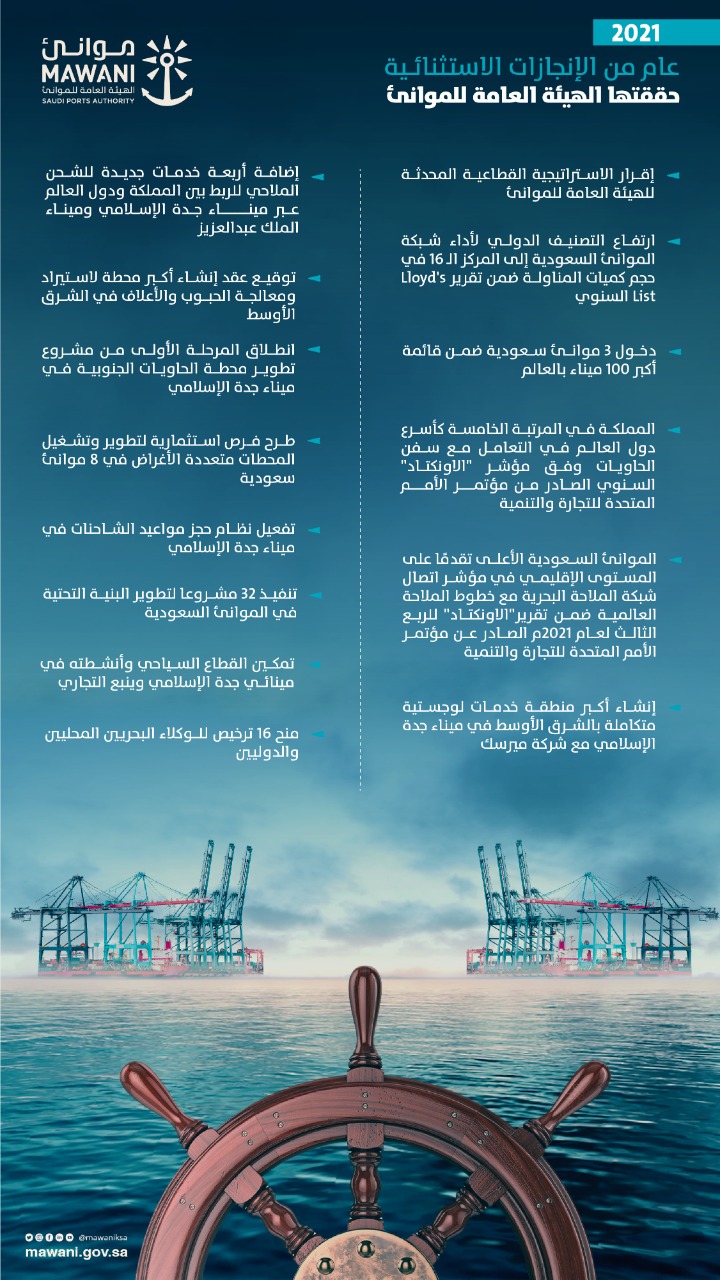 موانئ” تسهم في تعزيز القدرات التنافسية للمملكة كمركزٍ لوجستي عالمي، وتؤكد التزامها بتحقيق المزيد من الإنجازات في 2022م