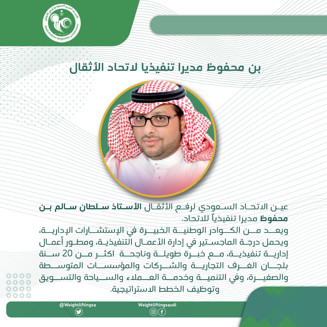 عين الاتحاد السعودي لرفع الأثقال الأستاذ سلطان سالم بن محفوظ مديرا تنفيذيا للاتحاد حيث يعد الأستاذ سلطان بن محفوظ من الكوادر الوطنية الخبيرة في الإستشارات الإدارية ، ويحمل درجة الماجستير في إدارة الأعمال التنفيذية، ومطور أعمال إدارية تنفيذية ، مع خبرة طويلة وناجحة أكثر من 20 سنة بلجان الغرف التجارية والشركات والمؤسسات المتوسطة والصغيرة، وفي التنمية وخدمة العملاء والسياحية والتسويق وتوظيف الخطط الاستراتيجية.