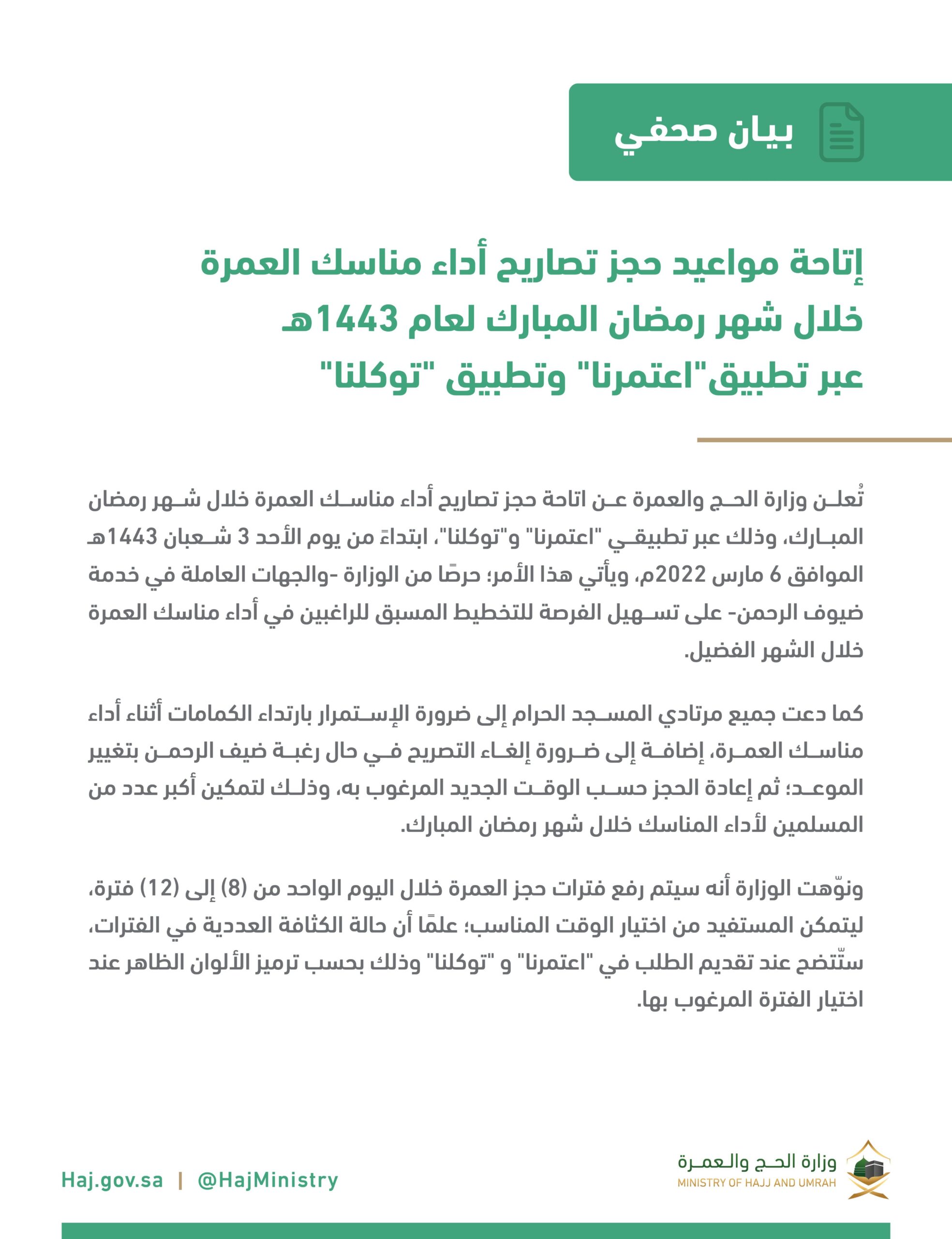 بتداءً من اليوم الأحد 3 شعبان 1443هـ : وزارة الحج والعمرة تُعلن عن اتاحة حجز أداء العمرة في شهر رمضان المبارك، عبر تطبيقاعتمرنا و توكلنا.