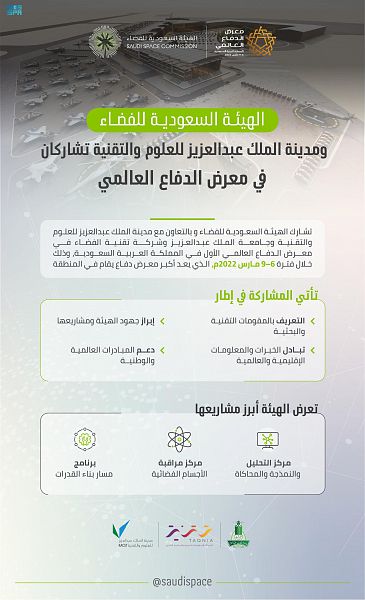 تشارك الهيئة السعودية للفضاء ومدينة الملك عبدالعزيز للعلوم والتقنية “كاكست”، بجناح في معرض الدفاع العالمي، الذي يقام في مدينة الرياض خلال المدَّة من 6 – 9 مارس 2022.