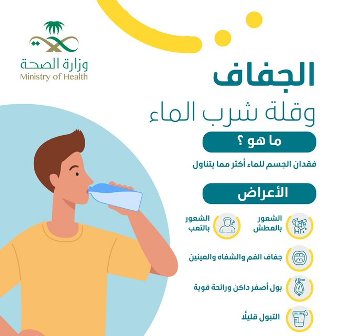 وأوضحت الوزارة، عبر حسابها الرسمي في تويتر ، أن الجفاف هو عبارة عن قلة شرب الماء الذي يمكن أن يتسبب في الحمى وفرط التعرق والقيء والإسهال والتبول الزائد