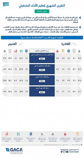 أصدرت الهيئة العامة للطيران المدني اليوم تقريرها الشهري عن أداء مطارات المملكة الدولية والمحلية، وذلك لشهر فبراير 2022م، وفقاً لأربعة عشر معياراً أساسياً لقياس الأداء، وتأتي تطبيقاً للتوجُّهات الإستراتيجية التي تستهدف تجويد الخدمات المُقدَّمة للمسافرين، ورفع مستواها، وتحسين تجربة المسافر في مطارات المملكة.