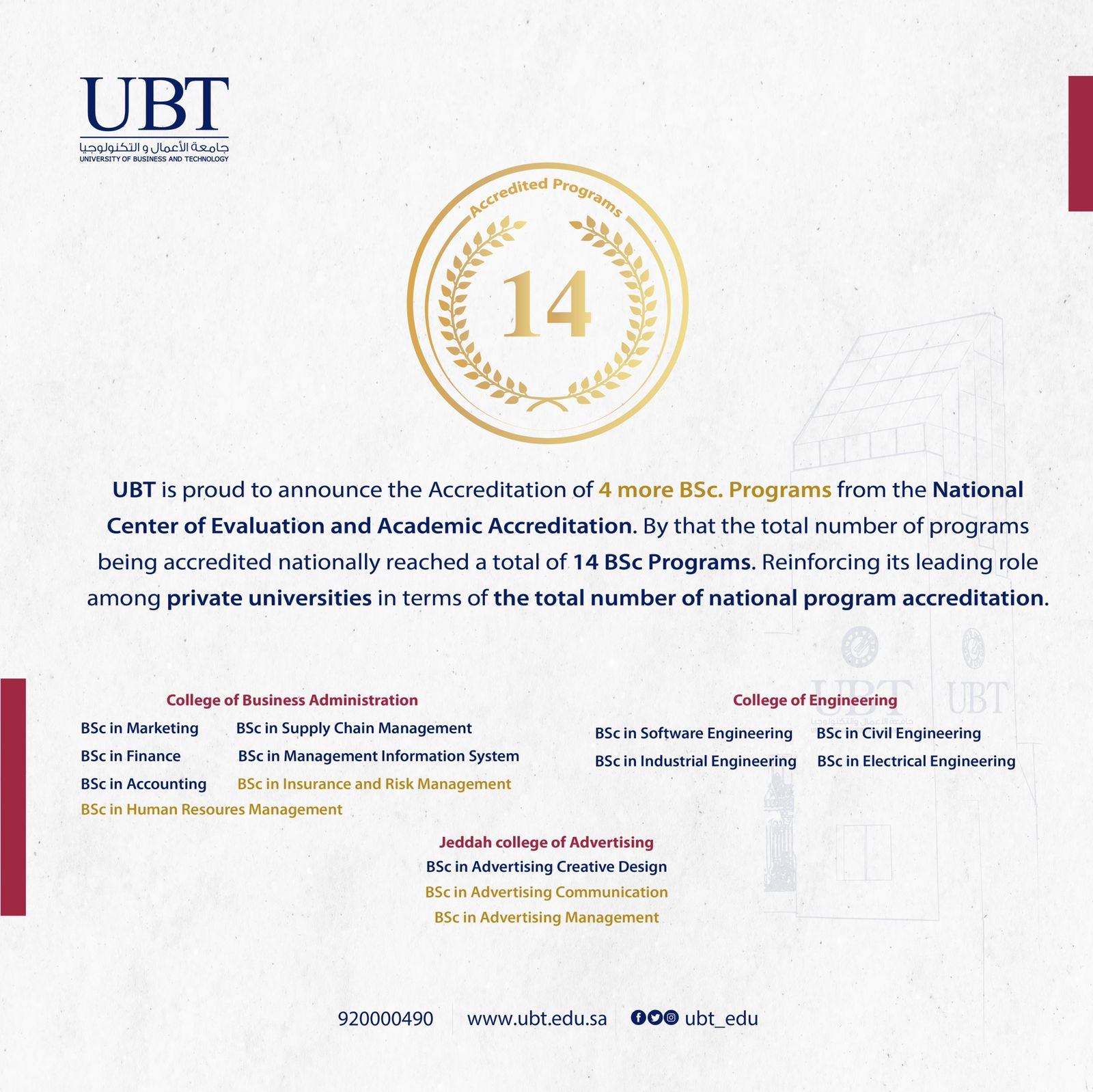 وتفخر الجامعة بحصول اربعة برامج اخرى على الإعتماد الإكاديمي البرامجي من المركز الوطني للتقويم والإعتماد ليصبح إجمالي عدد البرامج الإكاديمية المعتمدة من المركز الوطني للتقويم والإعتماد الإكاديمي 14 برنامج أكاديمي، والبرامج الأربعة التي حصلت على الإعتماد الإكاديمي البرامجي هي : برنامج بكالوريوس ادارة الإعلان وبرنامج اتصالات الإعلان بكلية الإعلان بجدة، وبرنامج بكالوريوس ادارة الموارد البشرية ، وبرنامج التأمين وادارة المخاطر بكلية ادارة الإعمال.