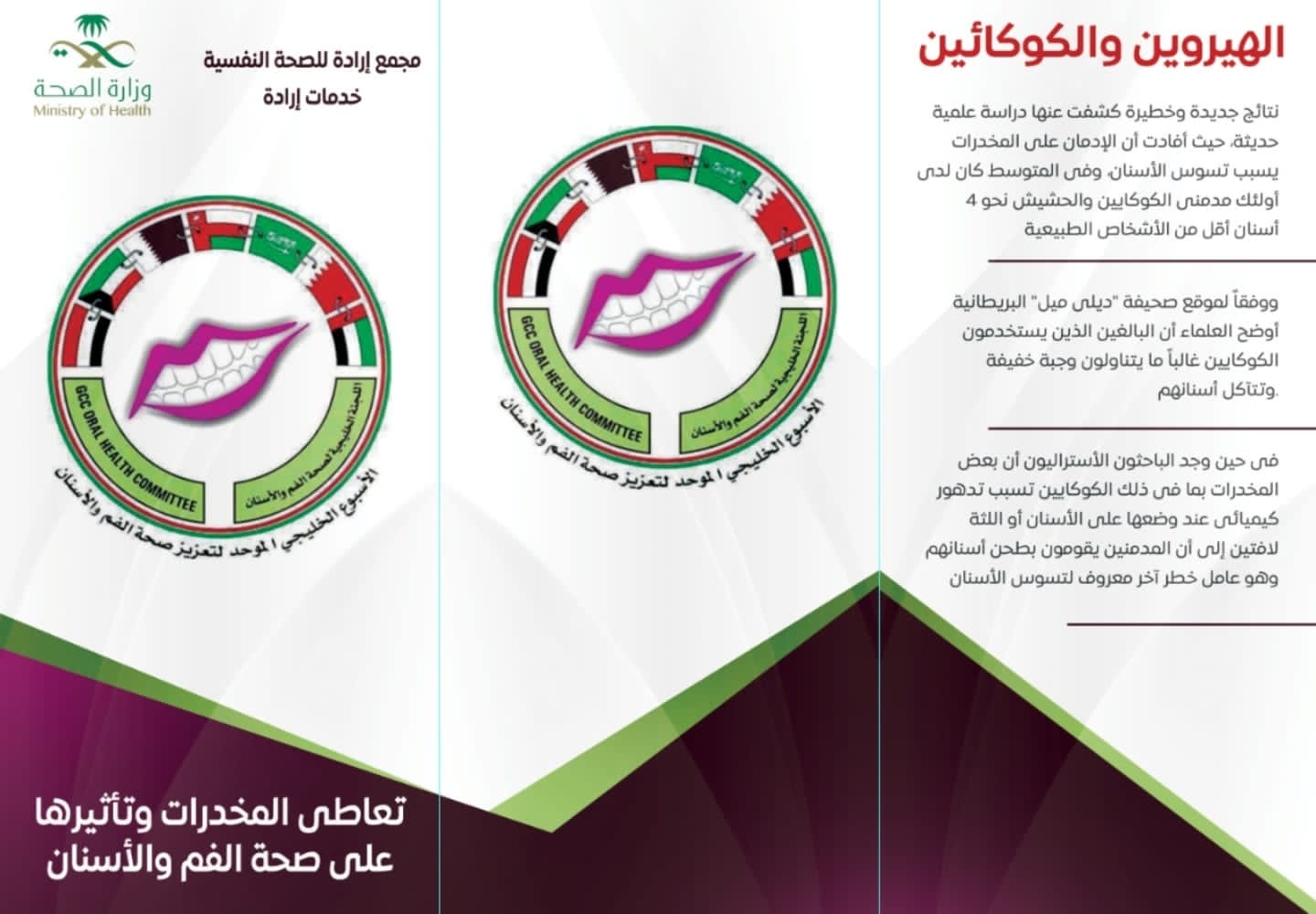 شارك مجمع إرادة والصحة النفسية لخدمات إرادة بجدة ممثلاً في قسم الأسنان وإدارة العلاقات العامة والإعلام والتوعية الصحية ليومي الأربعاء والخميس الماضي الموافق ٢٤ _ ٢٥ مارس الجاري في حملة الأسبوع الخليجي لصحة الفم والأسنان بهدف رفع مستوى الوعي والإدراك بين أفراد الأسرة والمجتمع من خلال الركن التوعوي الذي إشتمل على اللوحات الإرشادية لطريقة تفريش الأسنان والتثقيف بأهمية اكل المواد الغذائية المفيدة لصحة الفم والأسنان وتجنب أكل المواد الغذائية الضارة التي تتسبب في تسوس الأسنان ، وتم تثقيف الحضور والزوار بالطريقة الصحيحة للأسنان بمجسم على شكل الأسنان.
