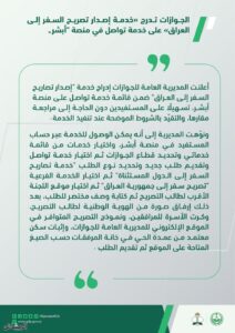 الرياض_سويفت نيوز : أدرجت الجوازات «خدمة إصدار تصريح السفر إلى العراق» على خدمة تواصل في منصة "أبشر".