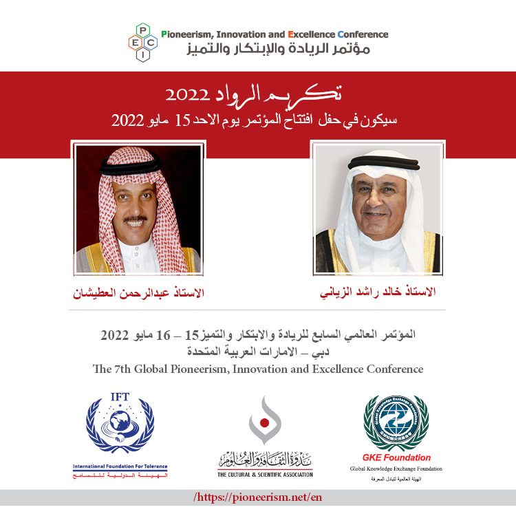 أعلن الدكتور عبد الحميد الرميثى الأمين العام للجنة المنظمة للمؤتمر العالمي للريادة والتميز والابتكار في دبي بالامارات العربية المتحدة أن المؤتمر يكرم في افتتاحه بدورته السابعة في الفترة من 15-16 مايو الشهر القادم كلا من رجل الاعمال السعودي الشيخ عبدالرحمن بن صالح العطيشان وخالد راشد الزياني.