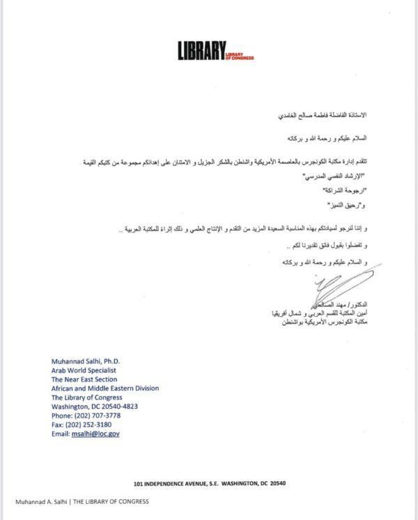 وقال الدكتور مهند الصالحي الأمين العام لمكتبة الكونجرس بأن المكتبة تلقت عدداً من إصدارات الأستاذة فاطمة الغامدي المتمثلة في “رحيق التميز” و”أرجوحة الشراكة” و”الإرشاد النفسي المدرسي”، لتنضم للمكتبة وتخدم روادها والباحثين عن العلوم النافعة .