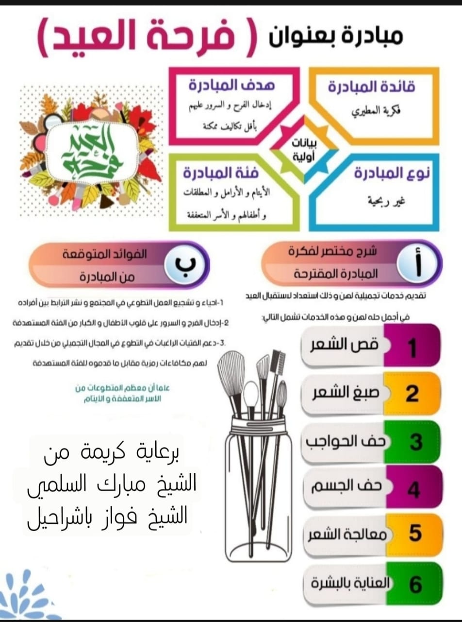 أقيمت بقاعة ليالي الماسة بجدة مساء يوم الثلاثاء الموافق 25 رمضان 1443 مبادرة فرحة العيد للأيتام والأرامل والمطلقات وأبناء الأسر المتعففة برعاية كريمة من الشيخ فواز باشراحيل والشيخ مبارك السلمي كتب الله اجرهما وجزاءهما الله خير الجزاء وما قدماه من أعمال خير يجدانه في ميزان حسناتهما .وكان هدف المبادرة إدخال السرور على قلوب الأيتام وكبار السن وتحفيز العمل التطوعي بين أفراد المجتمع حيث كانت الخدمات المقدمة لهن من المتطوعات قص وصبغ الشعر وحف الجسم والحواجب والعناية بالبشرة ومعالجة الشعر حتى يظهرن بأحلى حلة في أيام العيد.