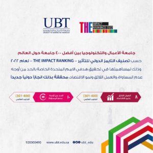 سجلت جامعة الأعمال والتكنولوجيا انجازاً دولياً جديداً بانضمامها لقائمة أفضل 400 جامعة حول العالم حسب تصنيف التايمز الدولي للتأثير – THE IMPACT Rankings – لعام 2022م، وذلك لمساهمتها في تحقيق هدفي الأمم المتحدة للتنمية المستدامة الخاصة بالحد من أوجه عدم المساواة، بالإضافة الى العمل الملائم ونمو الاقتصاد، والتي أعلنت نتائجها مساء يوم الأربعاء الموافق 27 أبريل 2022م، بملتقى التأثير والابداع المقام في مدينة ستوكهولم بالسويد من قبل منظمة التايمز الدولية، حيث ضمت القائمة قرابة 1500 جامعة من 110 دولة/منطقة حول العالم، والتي بادرت بمشاركة بياناتها التي توثق مساهمتها نحو تحقيق أهداف الأمم المتحدة للتنمية المستدامة والتي تضم 17 هدفاً، حيث يتم تقييمها بشكل مستقل من قبل خبراء مستقلين في مجال التنمية المستدامة تم انتقاءهم بعناية، وتتم عملية التقييم وفق آلية واضحة ومعلنة من قبل جهة التصنيف الدولية (Times Higher Education Impact Ranking).