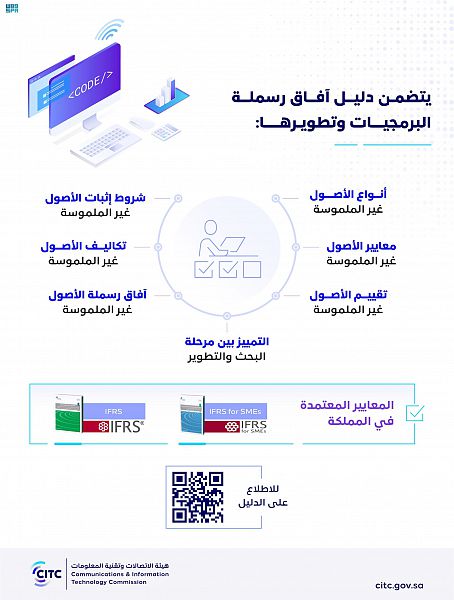 أصدرت هيئة الاتصالات وتقنية المعلومات الدليل التوعوي لآفاق رسملة البرمجيات وتطويرها، الذي يتضمن أبرز أساليب المعالجة المحاسبية لمصاريف البرمجيات والتطبيقات الحاسوبية، وذلك تفعيلا لدورها في تنظيم قطاع تقنية المعلومات والتقنيات الناشئة، وتطوير سوق وصناعة البرمجيات في المملكة.