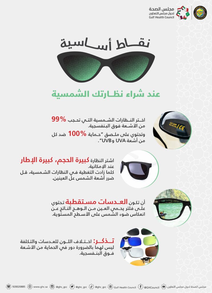 وأضاف مجلس الصحة الخليجي حول النظارات الشمسية بان هناك نقاط أساسية لابد الاخذ بها عند الشراء، وأهمها اختيار التي تحجب 99% من الأشعة فوق البنفسجية، و تحتوي على ملصق يفيد بحمايتها بنسبة 100% ضد كل من أشعة UVA و UVB.