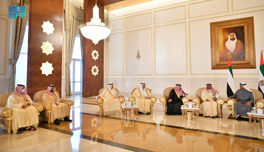 استقبل صاحب السمو الشيخ محمد بن زايد آل نهيان، رئيس دولة الإمارات العربية المتحدة، في العاصمة أبوظبي، مساء أمس، صاحب السمو الملكي الأمير مقرن بن عبدالعزيز آل سعود، وصاحب السمو الملكي الأمير منصور بن سعود بن عبدالعزيز، وصاحب السمو الملكي الأمير محمد بن فهد بن عبدالعزيز، وصاحب السمو الملكي الأمير الدكتور منصور بن متعب بن عبدالعزيز وزير الدولة عضو مجلس الوزراء مستشار خادم الحرمين الشريفين، وصاحب السمو الملكي الأمير بندر بن مقرن بن عبدالعزيز، وصاحب السمو الملكي الأمير خالد بن سلمان بن عبدالعزيز نائب وزير الدفاع، الذين قدموا واجب العزاء في وفاة صاحب السمو الشيخ خليفة بن زايد آل نهيان ـ رحمه الله ـ.