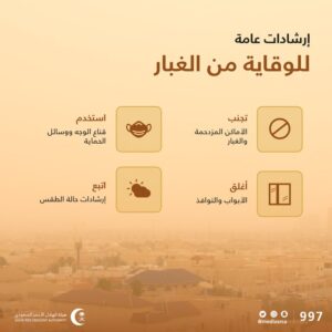 وأوضحت الهيئة، على حسابها الرسمي بموقع التواصل الاجتماعي “تويتر”، أن هناك 4 طرق للوقاية من موجة الغبار، تتمثل في تجنب الأماكن المزدحمة والغبار، واستخدام قناع الوجه ووسائل الحماية، وإغلاق الأبواب والنوافذ، مع اتباع إرشادات حالة الطقس.