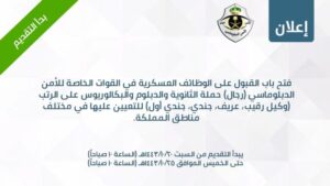 أعلنت وزارة الداخلية (الإدارة العامة للقبول المركزي) عن فتح باب القبول والتسجيل على الوظائف العسكرية في القوات الخاصة للأمن الدبلوماسي (رجال) على الرتب (وكيل رقيب، عريف، جندي، جندي أول) للتعيين عليها في مختلف مناطق المملكة.