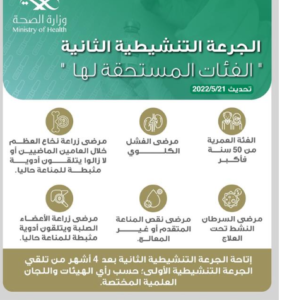 كشفت وزارة الصحة اليوم السبت موعد تلقي الجرعة التنشيطية الثانية من لقاح كورونا لعدد من الفئات .