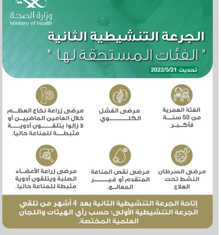 وأبانت أن الفئات المستهدفة هي: الفئة العمرية من 50 عامًا فأكبر، ومرضى الفشل الكلوي، ومرضى زراعة نخاع العظم خلال العامين الماضيين أو لا يزالون يتلقون أدوية مثبطة للمناعة حاليا.