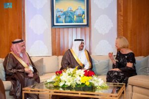 وكان في استقبال سموه لدى وصوله مقرّ الحفل القائمةُ بأعمال سفارة الولايات المتحدة الأميركية لدى المملكة السيدة مارتينا سترونغ وعددٌ من المسؤولين بالسفارة.
