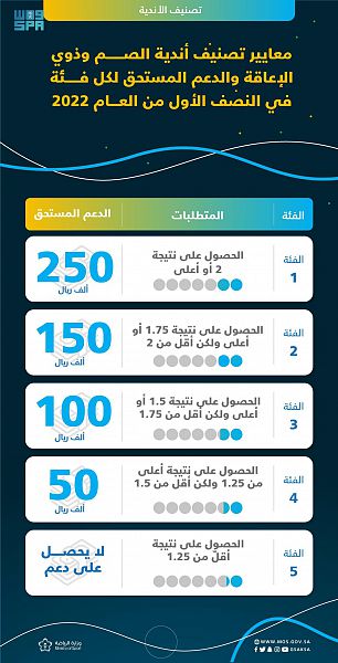 أعلنت وزارة الرياضة، ممثلة بالإدارة العامة لشؤون الأندية الرياضية اليوم، نتائج تقييم مبادرة الحوكمة للنصف الأول لعام 2022، لأندية الصم وذوي الإعاقة، التي تخولها الحصول على دعم مباشر، وفقاً للتصنيف والمعايير.
