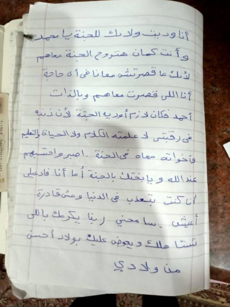 وجاء نص الرسالة كالآتي: “أنا يا محمد وديت ولادك للجنة، أنت كمان هتروح معاهم الجنة، علشان ما قصرتش معانا في أي حاجة، أنا اللي قصرت معاهم وبالذات أحمد، فكان لازم أوديه الجنة، لأن ذنبه فى رقبتي، لا علمته الكلام ولا الحياة ولا التعليم، وإخواته معاه فى الجنة، اصبر واحتسبهم عند الله، ويا بختك بالجنة، أما أنا فادعي لي علشان كنت بتعذب في الدنيا ومش قادرة أعيش، سامحني ربنا يكرمك باللى تستاهلك ويعوض عليك بولاد أحسن من ولادي”.