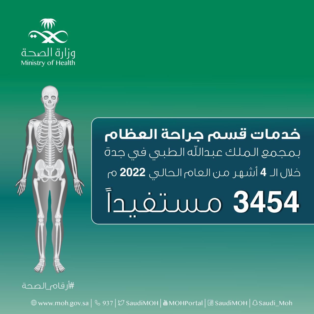 قدّم قسم جراحة العظام بمجمع الملك عبدالله الطبي في جدة خدماته الطبية خلال الـ 4 أشهر من العام الحالي 2022م لـ 3454 مستفيداً عبر غرف العمليات و عيادات جراحة العظام الخارجية و التي تنوعت ما بين حالات مرضية و حالات جراحية و حالات إصابات الكسور والحوادث و بيّنت الإحصائية إجراء نحو 89 عملية فيما سجلت عيادات العظام وصول 3365 مراجعاً .