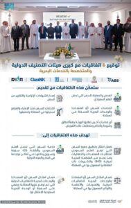 وَقَّعَ معالي رئيس الهيئة العامة للنقل الدكتور رميح بن محمد الرميح عددًا من الاتفاقيات مع هيئات التصنيف البحرية؛وذلك بهدف تقديم مجموعةٍ من الخِدْمَاتِ البحريةِ للسفن السعودية في أماكن وجودها في البحار والمياه الدولية.