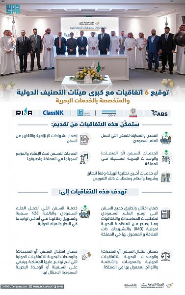 وبلغَ مجموعُ الاتفاقياتِ المُوَقَّعَةِ-اليوم- 6 اتفاقياتٍ مع كبرى هيئات التصنيف البحرية على مستوى العالم،وذلك في إطار الدور المنوط بالهيئة العامة للنقل كونها السلطةَ التشريعيةَ والتنظيميةَ لقطاع النقل البحري في المملكة، والتأكد من امتثال وتطبيق جميع السفن التي ترفع العلم السعودي لمتطلبات المعاهدات والاتفاقيات وما يصدرُ من المنظمة البحرية لدولية (IMO) والتشريعات ذات العلاقة والمعمول بها في المملكة باختيار الهيئات التصنيفات البحرية المعتمدة من قبل الاتحاد الدولي لهيئات التصنيف وتفويضها للقيام بالأعمال الفنية اللازمة وإصدار الشهادات؛وذلك للحفاظ على سلامة الأرواح والممتلكات والموانئ خلال إبحار السفن حول العالم.