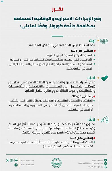 صرح مصدر مسؤول في وزارة الداخلية، بأنه بناءً على متابعة الوضع الوبائي لجائحة فيروس كورونا وما رفعته الجهات الصحية المختصة وللمكتسبات العديدة المتحققة في مكافحة الجائحة بفضل الله ثم الدعم غير المحدود من القيادة الرشيدة، وتضافر الجهود الوطنية الفعالة من الجهات كافة، والتقدم – ولله الحمد – في برنامج اللقاحات الوطني وارتفاع نسَبْ التحصين والمناعة ضد الفيروس في المجتمع.