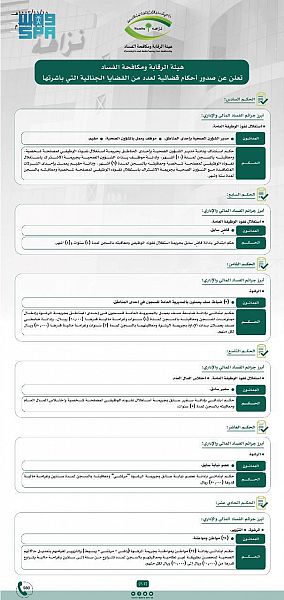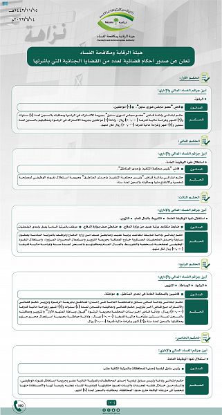 صرح مصدر مسؤول بهيئة الرقابة ومكافحة الفساد، بأنه إلحاقاً لما سبق الإعلان عن مباشرة الهيئة لعدد من القضايا الجنائية خلال الفترة الماضية، فقد صدرت أحكام قضائية بحق عدد من المتورطين بجرائم فساد مالي وإداري بعد ثبوت إدانتهم، وكانت أبرزها على النحو الآتي: