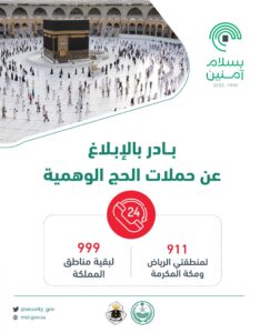 الرياض_سويفت نيوز : الأمن العام : للإبلاغ عن حملات الحج الوهمية، اتصل بالرقم (911) لمنطقتي الرياض و مكة المكرمة و(999) لبقية مناطق المملكة