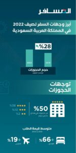 كما زاد الإنفاق على السفر المحلي داخل المملكة العربية السعودية بنسبة 7٪ مع استمرار السعوديين في استكشاف العديد من مناطق الجذب في المملكة. أصبحت أبها في منطقة عسير الغنية ثقافياً، وجهة ذات شعبية متزايدة هذا الصيف حيث ارتفعت الحجوزات بنسبة 125٪ مقارنة بصيف 2019.