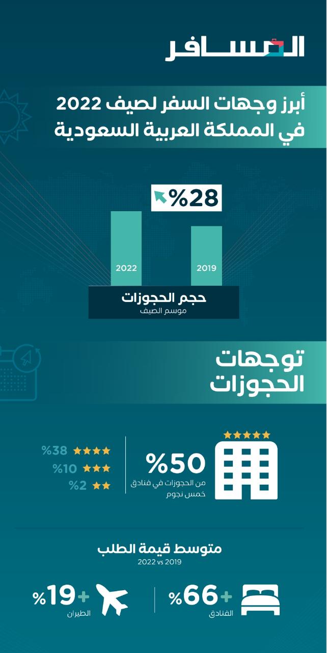 المسافرون السعوديون يواصلون الاستمتاع بالرفاهية عبر تجارب متعددة و اختيار إقامتهم في أماكن فاخرة بتفضيل فنادق الخمس نجوم والتي مثلت ما يقارب 50٪ من حجوزات الفنادق هذا الصيف. مع عودة الأشخاص إلى السفر، فإنهم قرروا إنفاق المزيد من الأموال للحصول على تجارب ذات مغزى، فقد ارتفع متوسط قيم الطلبات للحجوزات بنسبة 66٪ للفنادق و 19٪ للرحلات الجوية، مقارنة بموسم الصيف في عام 2019.