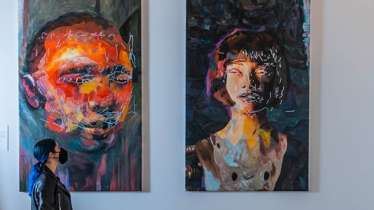 صورتين للرسامة والشاعرة الروبوت أيده (Ai-Da) ولوحات من اعمالها