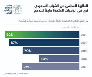 وبحسب الاستطلاع، بلغت نسبة الشباب السعودي الذي يعتبر الولايات المتحدة حليفاً للمملكة هذا العام مستواها الأعلى خلال السنوات الخمس الأخيرة. فقد أظهرت نتائج استطلاع عام 2020 أن 87% من الشباب السعودي يعتبر الولايات المتحدة “حليفاً حقيقياً” أو “دولة حليفة نوعاً ما”، بزيادة جيدة عن نتائج عامي 2019 و2018 اللذين وصلت فيهما هذه النسبة إلى 70% و50%، على التوالي.