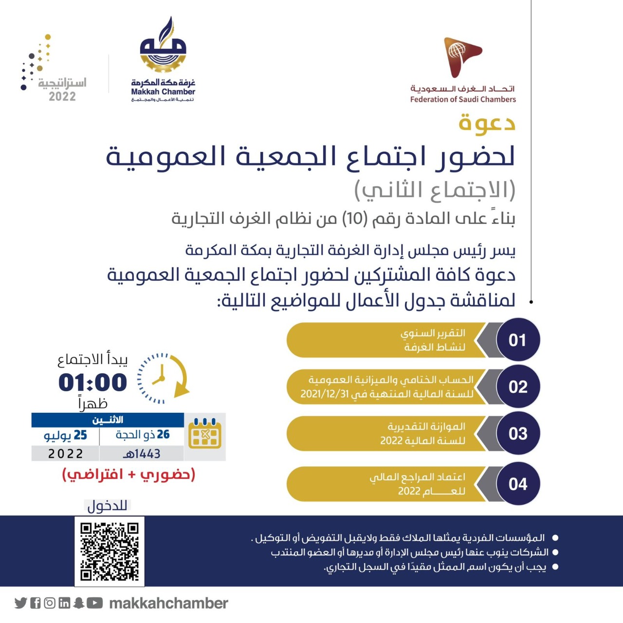 دعت الغرفة التجارية بمكة المكرمة منتسبيها من رجال وسيدات الأعمال لحضور اجتماع الجمعية العمومية الثاني للعام المالي المنصرم، وذلك استناداً على المادة رقم (10) من نظام الغرف التجارية، والذي سيعقد حضورياً بمقر الغرفة على طريق الأمير محمد بن سلمان، وكذلك عبر الاتصال المرئي في الساعة الواحدة بعد ظهر يوم الإثنين 25 يوليو الموافق 26 ذو الحجة الجاري.