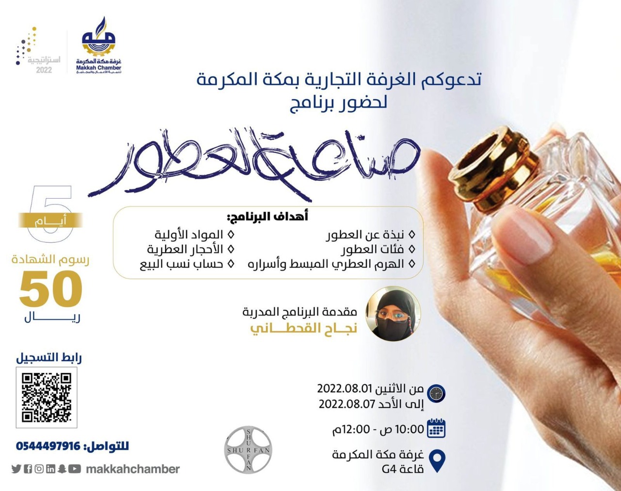 تطلق الغرفة التجارية بمكة المكرمة الأحد المقبل أول برنامج من نوعه للراغبين في احتراف صناعة العطور بالعاصمة المقدسة، الذي يستهدف 20 متدرباً، وذلك ضمن برامج الاستثمار في الكوادر البشرية، الذي تضمنته استراتيجية الغرفة 2022، التي تؤكد على ضرورة الاستثمار في الكوادر البشرية، والتنقيب عن المواهب والمهارات تفعيلاً للدور الاجتماعي للغرفة.
