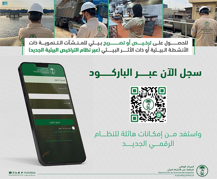 وحث الجهات والمنشآت التنموية ذات الأثر البيئي كافة على التسجيل في نظام التصاريح الرقمي عبر الرابط: https://ecompliance.ncec.gov.sa/NCEC/Welcome.aspx, مؤكداً توفير الدعم على مدار الساعة عبر الرقم 988 أو الإيميل [email protected].